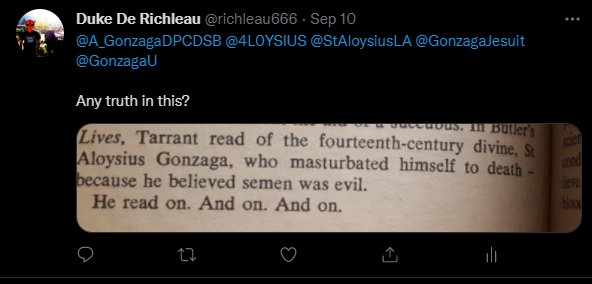 There is one part where Johnson claims that Saint Aloysius Gonzaga masturbated himself to death. I love reading about Saints and Popes who have done messed up stuff, and I had to check this out. I’m pretty sure that Ken just made this one up. He references Butler’s Lives of the Saints as his source for this information, but I checked a couple of editions of that book and neither mentioned death by wanking. They actually claim that Saint Gonzaga died of a disease he contracted while tending to sick people. He is believed (by some) to have lived his entire life without committing a mortal sin, and he’s known for his devotion to chastity. I’m always down to trash Christianity, and I think it’s hilarious if Kenneth Rayner Johnson was being deliberately offensive here, but I am also very, very intrigued. Are there any other sources that claim that Saint Gonzaga died from wanking? I can’t find any online, so I asked the experts. I still haven’t gotten a response.